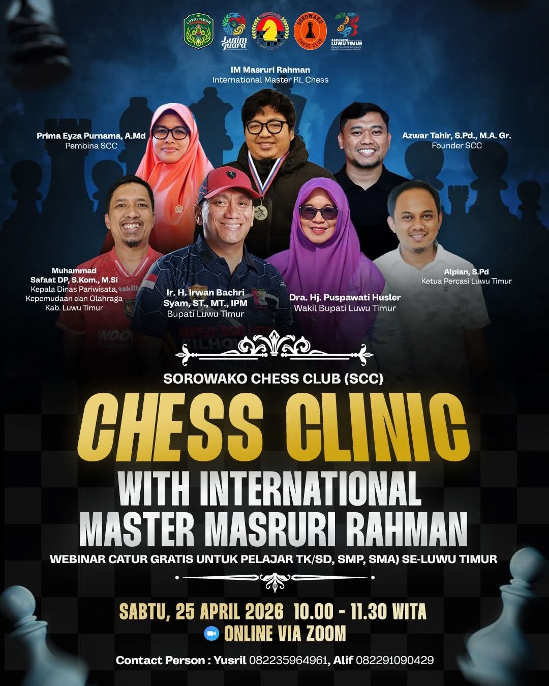 Luwu Timur, Sulsel– Sorowako Chess Club (SCC) kembali menunjukkan komitmennya dalam mengembangkan olahraga catur di Kabupaten Luwu Timur dengan menggelar kegiatan Chess Clinic bersama Master Internasional, Masruri Rahman. Kegiatan ini akan dilaksanakan secara daring melalui Zoom pada Sabtu, 25 April 2026 pukul 10.00–11.30 WITA, dan terbuka gratis bagi pelajar tingkat TK, SD, SMP, hingga SMA se-Luwu Timur.